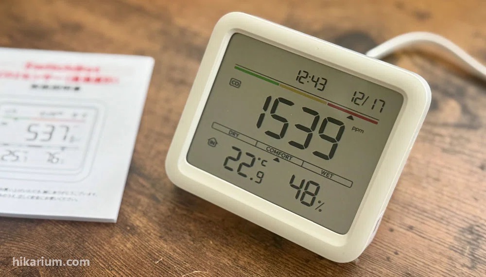 部屋の二酸化炭素濃度には快適に過ごすための基準値があって、それを測れます。ちなみに5000ppmは即異常をきたすレベルのやばい値です。