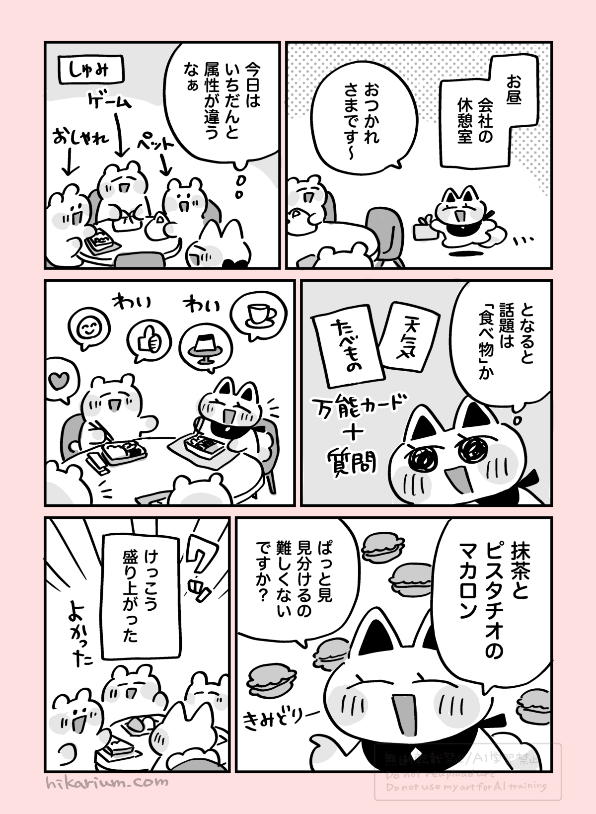 朝の挨拶で「天気」カードを消費して、そのほかのシーンで活躍するのが「食べ物」カードってイメージです。