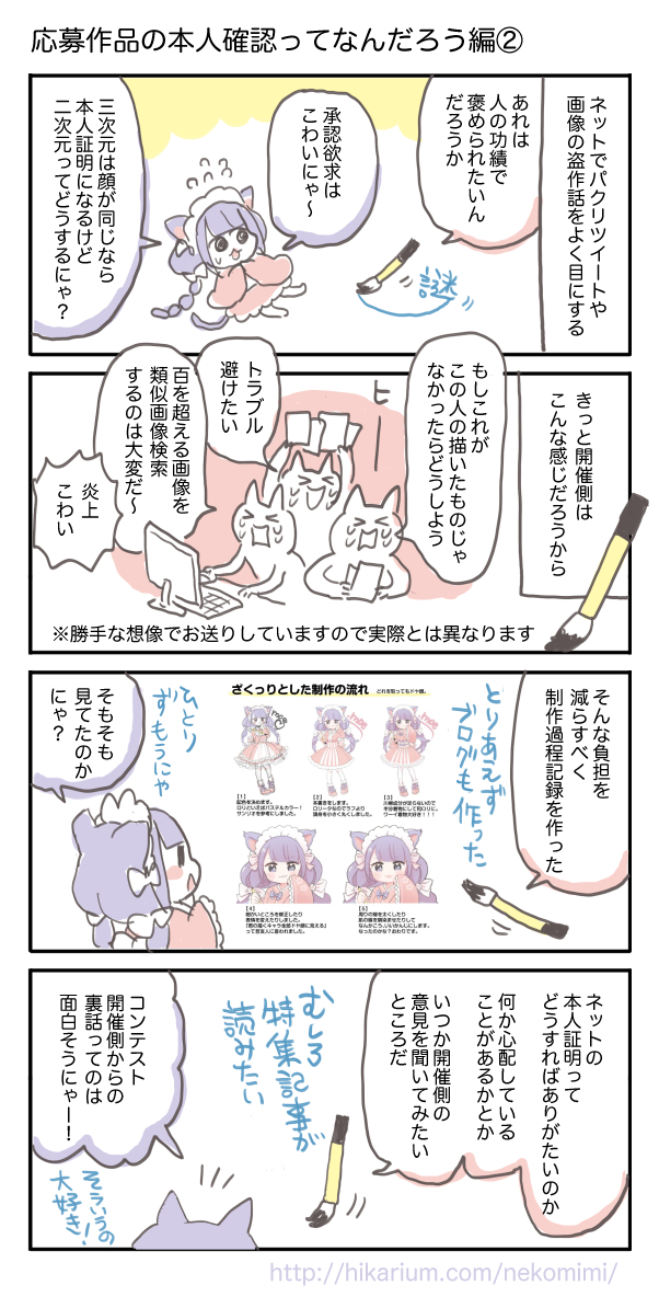 でもこんなことしなくても、実績があればアイデアはともかく絵自体は自分のものだって証明できるんですよね。本人証明は、Twitterやpixivやブログをやっていて同じ画風の絵が他にも置いてあれば回避できる心配なのかもしれない。